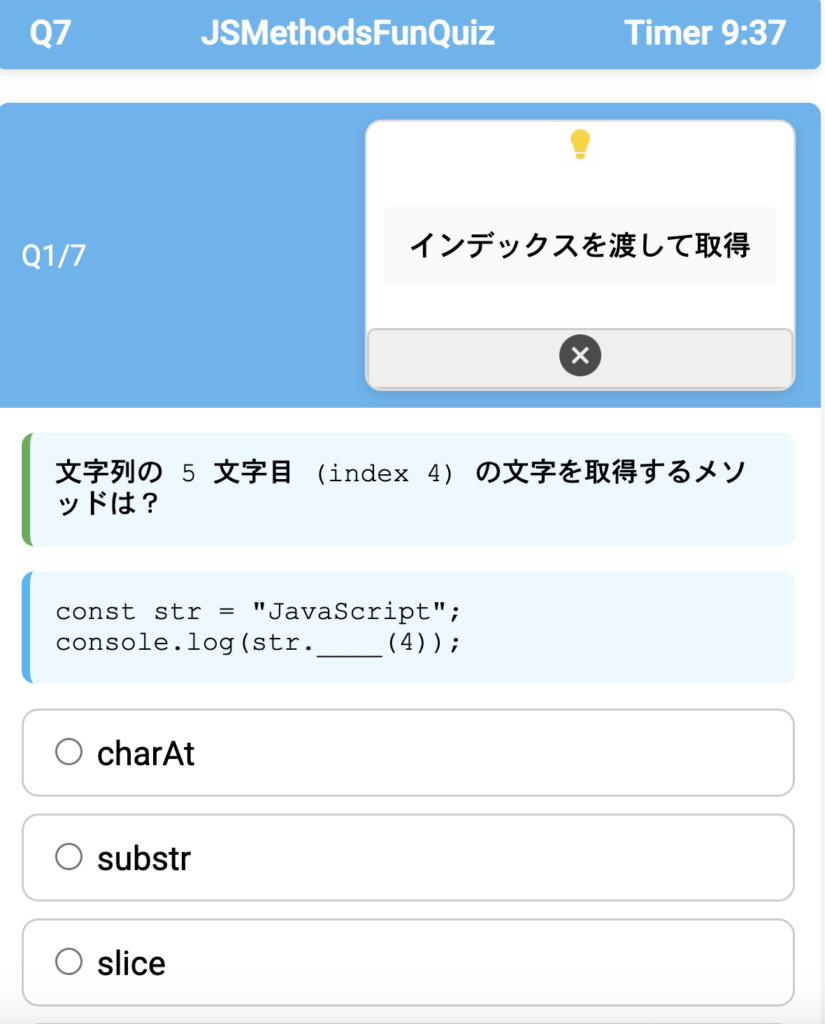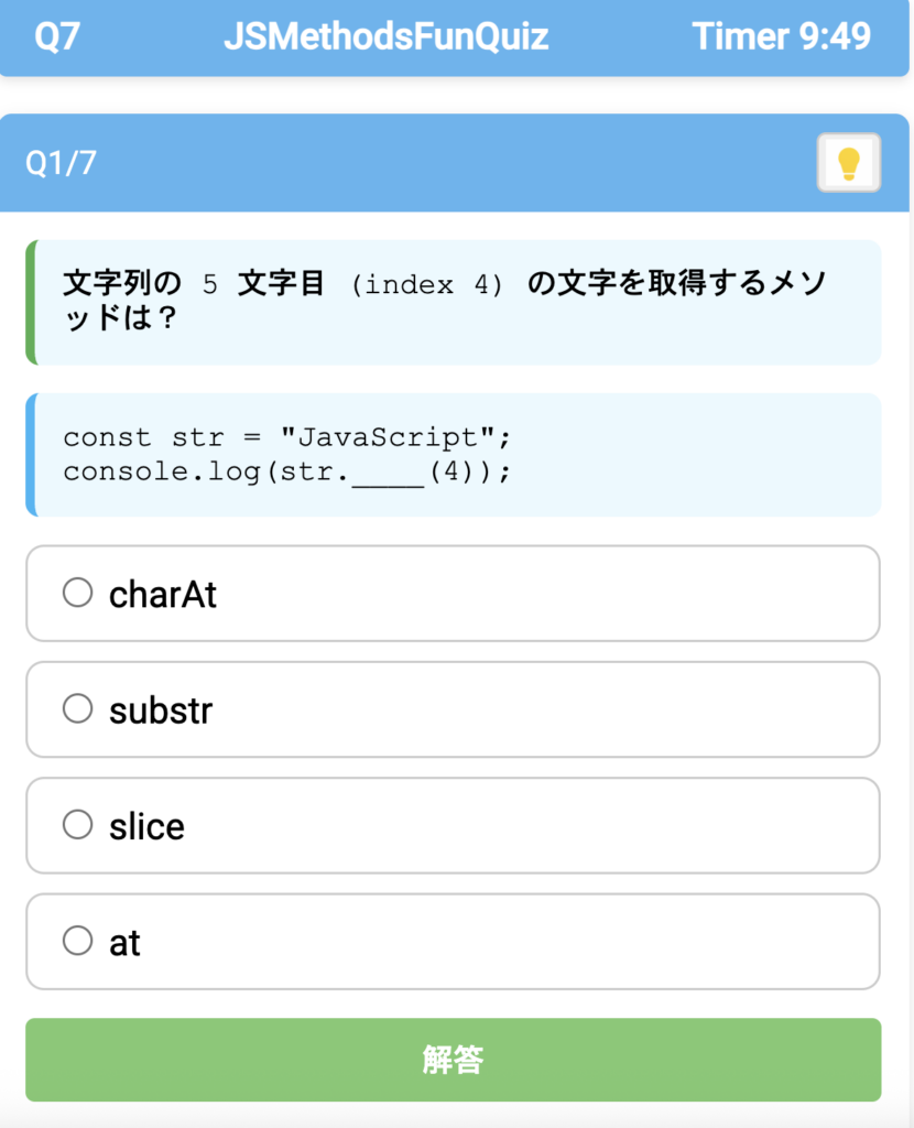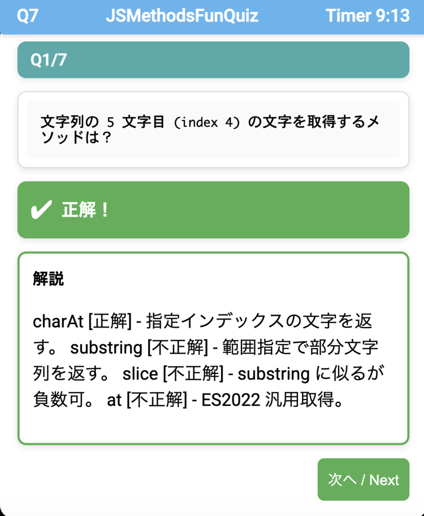 | 目的 | 通勤時間や待ち時間を活用して、手軽にJavaScriptのメソッドの学習ができる |