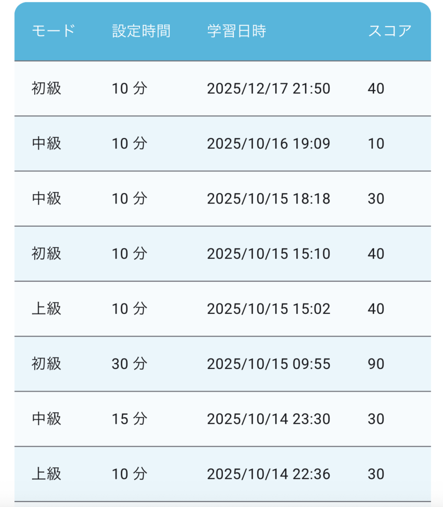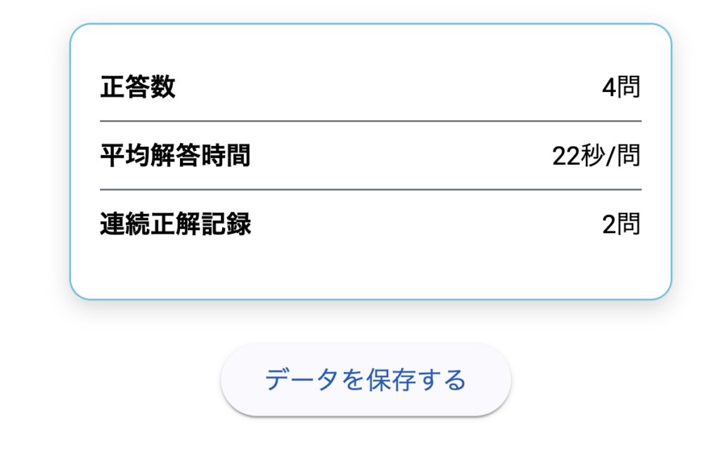 結果画面では、「正答数」「平均解答時間」「連続正解記録」の3つが表示され、保存も可能です。